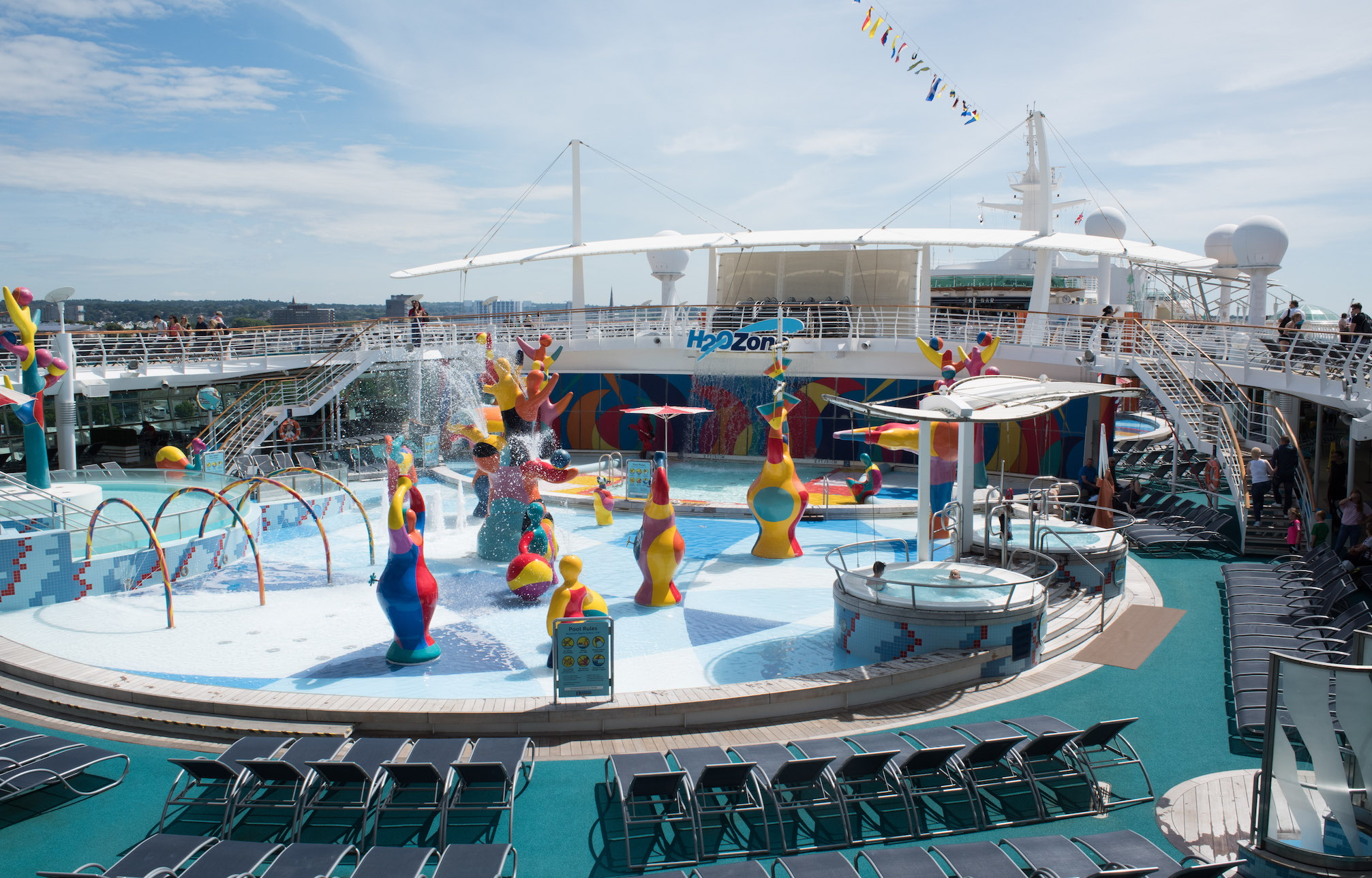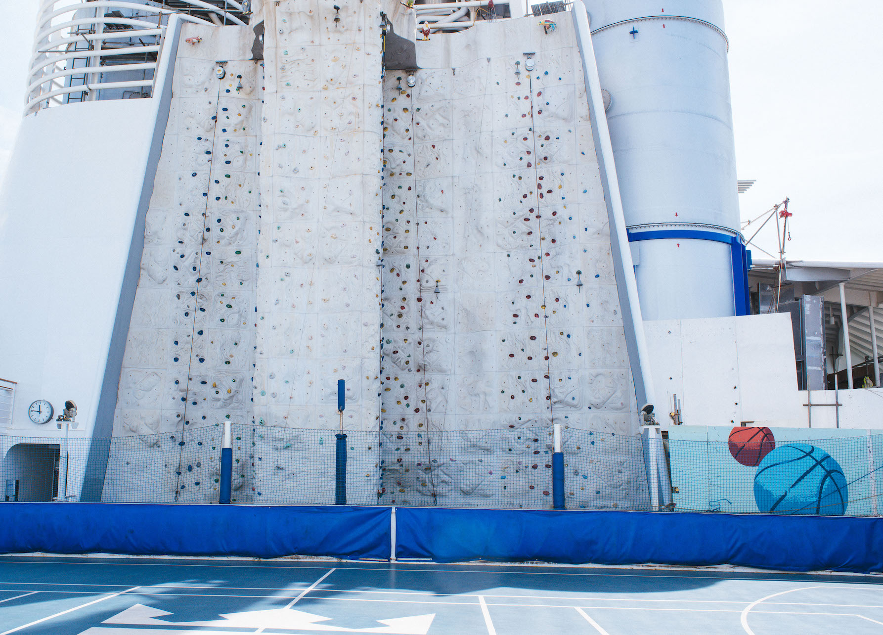 It is not just the family configured rooms which demonstrate that cruising is not just for older people. The entertainment is very family orientated, with the pool area, so called the H2O zone, complete with fountains and water cannons, as well as crazy golf, a climbing wall,  the flowrider which is a surfing simulator. A running track flows along the perimeter of the deck, and there is a basketball court and sports court.